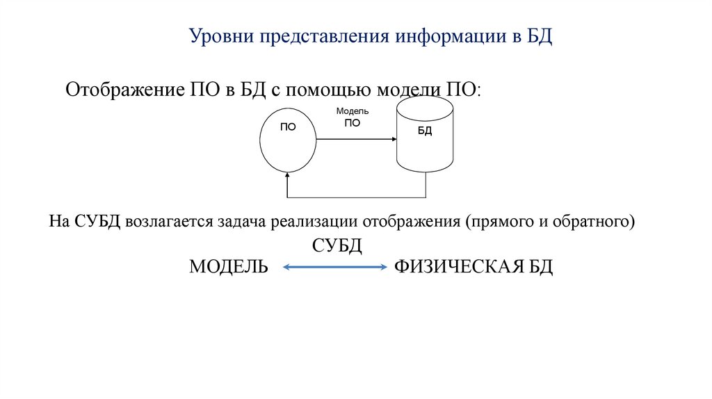 Уровни представления информации в БДОтображение ПО в БД с помощью модели ПО: