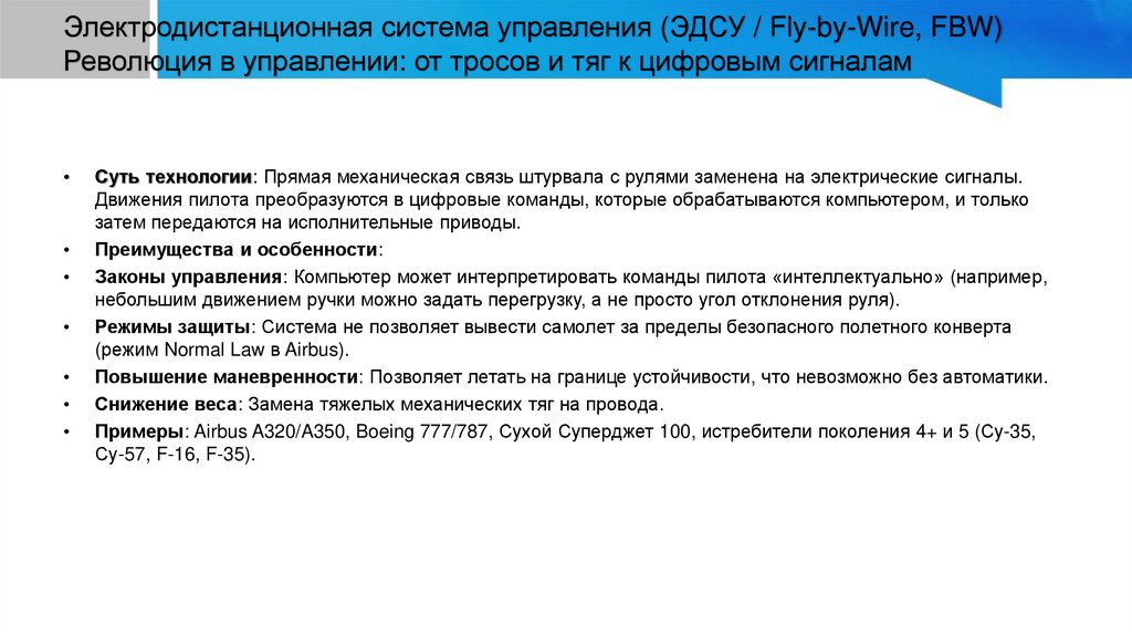 Электродистанционная система управления (ЭДСУ / Fly-by-Wire, FBW)Революция в управлении: от тросов и тяг к цифровым сигналам