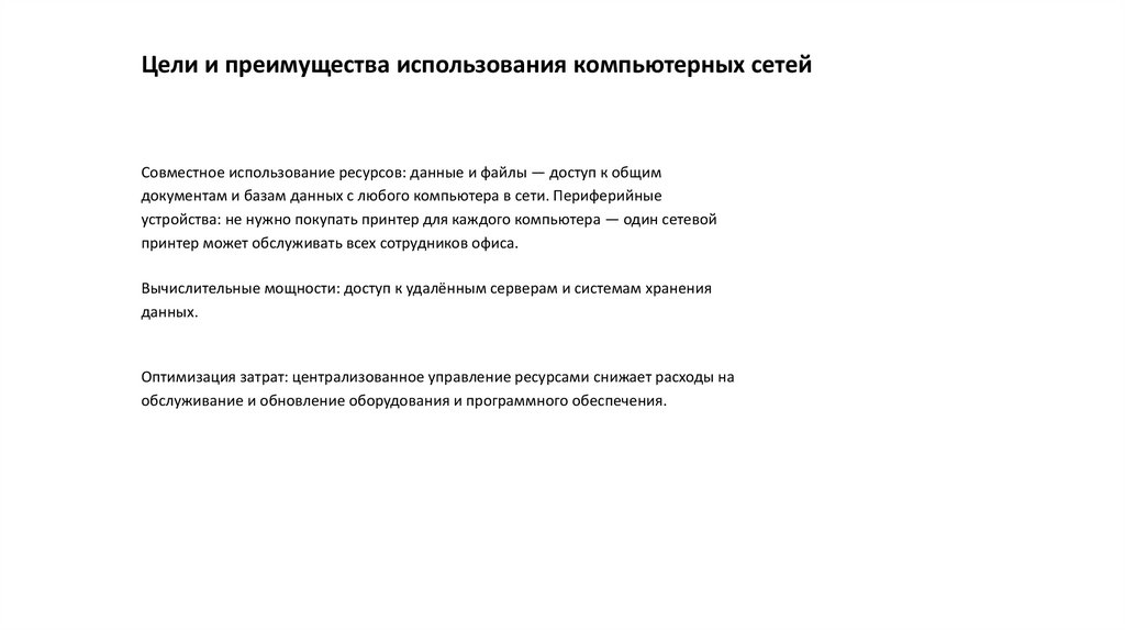 Цели и преимущества использования компьютерных сетейСовместное использование ресурсов: данные и файлы — доступ к общим