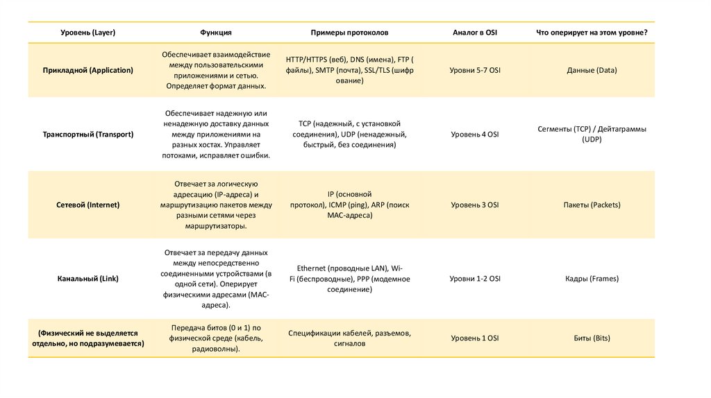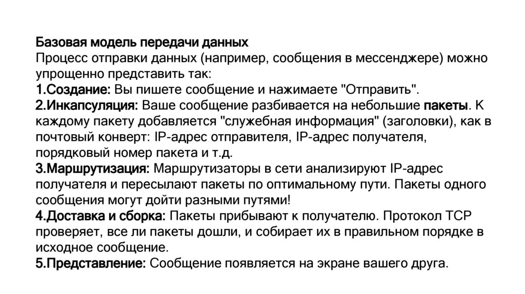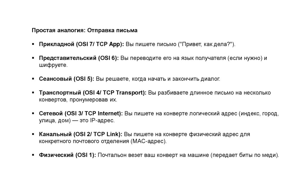 Простая аналогия: Отправка письмаПрикладной (OSI 7/ TCP App): Вы пишете письмо ("Привет, как дела?").