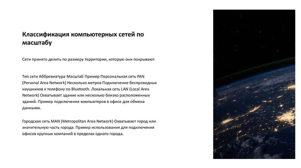 Городская сеть MAN (Metropolitan Area Network) Охватывает город или