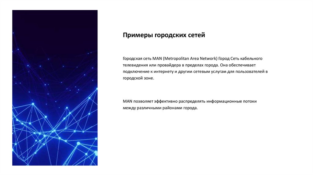 Примеры городских сетейГородская сеть MAN (Metropolitan Area Network) Город Сеть кабельного