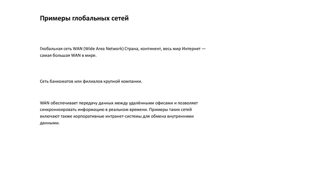 Примеры глобальных сетейГлобальная сеть WAN (Wide Area Network) Страна, континент, весь мир Интернет —