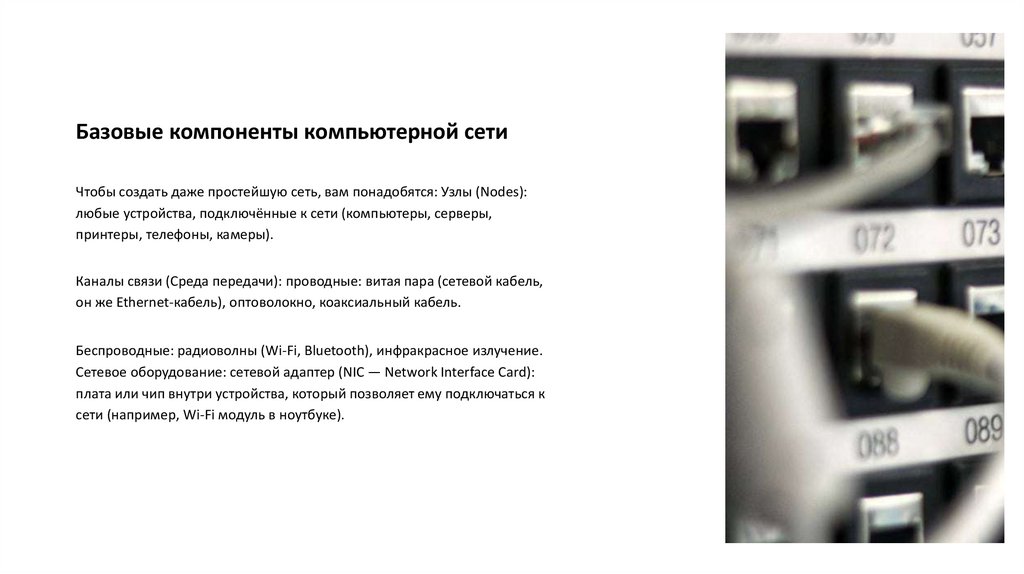 Базовые компоненты компьютерной сетиЧтобы создать даже простейшую сеть, вам понадобятся: Узлы (Nodes):