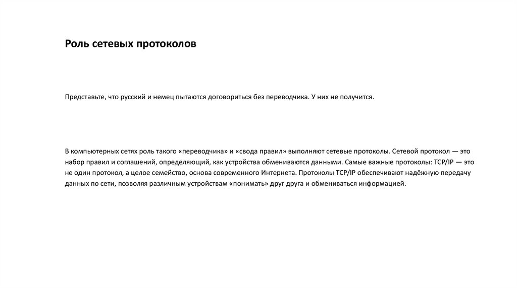 Роль сетевых протоколовПредставьте, что русский и немец пытаются договориться без переводчика. У них не получится.