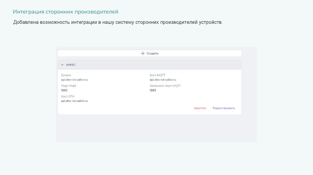 Интеграция сторонних производителейДобавлена возможность интеграции в нашу систему сторонних производителей устройств.