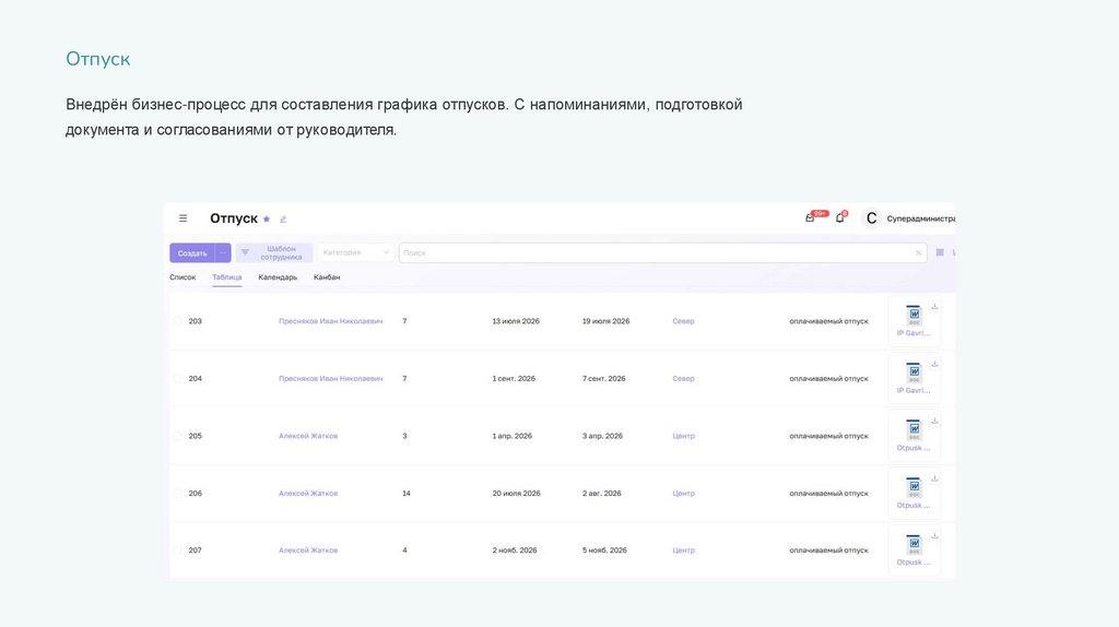 ОтпускВнедрён бизнес-процесс для составления графика отпусков. С напоминаниями, подготовкой