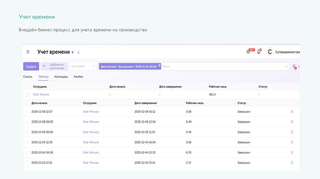 Учет времениВнедрён бизнес-процесс для учета времени на производстве