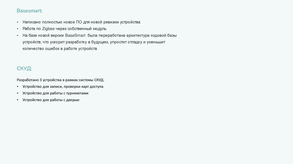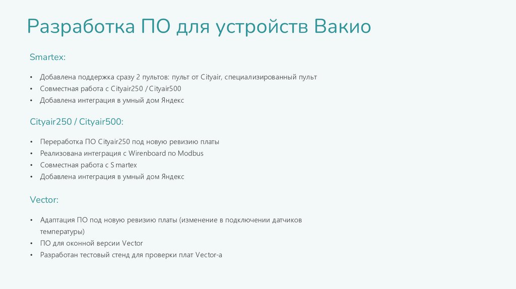 Разработка новых устройств линейки продукции Vakio. Переработка ПО под единый стандарт уже существующих. Разработка интеграций с сторонними системами
