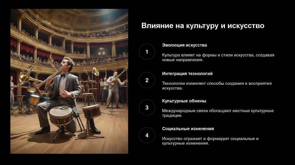 Культура влияет на формы и стили искусства, создавая