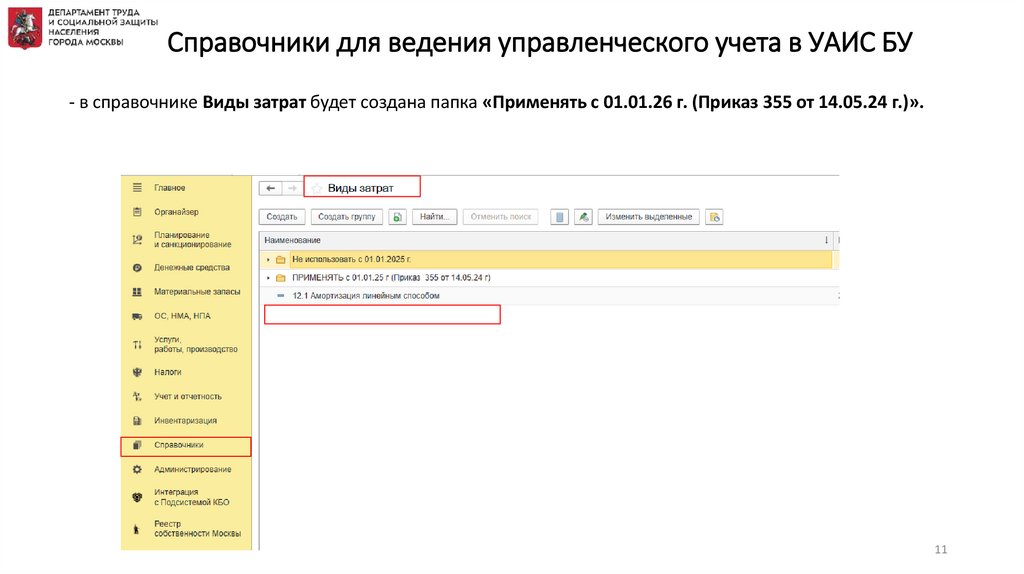 Справочники для ведения управленческого учета в УАИС БУ- в справочнике Виды затрат будет создана папка «Применять с 01.01.26 г. (Приказ 355 от 14.05.24 г.)».