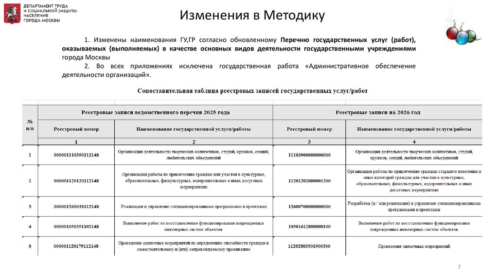 Изменения в Методику1. Изменены наименования ГУ,ГР согласно обновленному Перечню государственных услуг (работ),