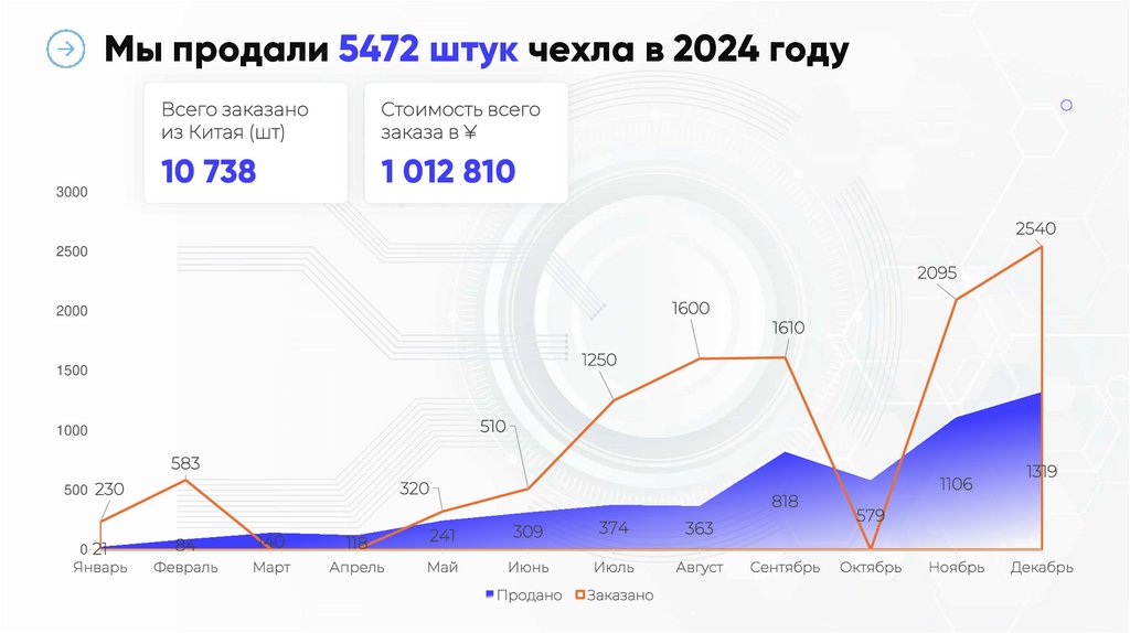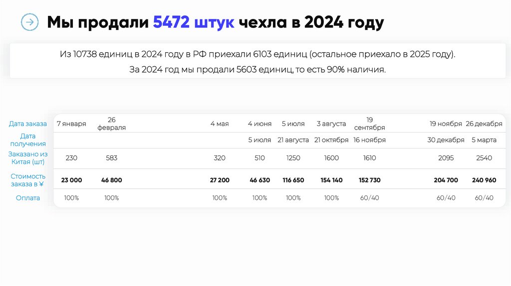 Мы продали 5472 штук чехла в 2024 годуИз 10738 единиц в 2024 году в РФ приехали 6103 единиц (остальное приехало в 2025 году).