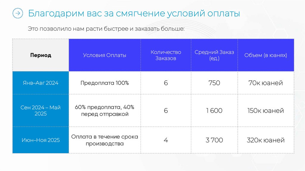 Благодарим вас за смягчение условий оплатыЭто позволило нам расти быстрее и заказать больше: