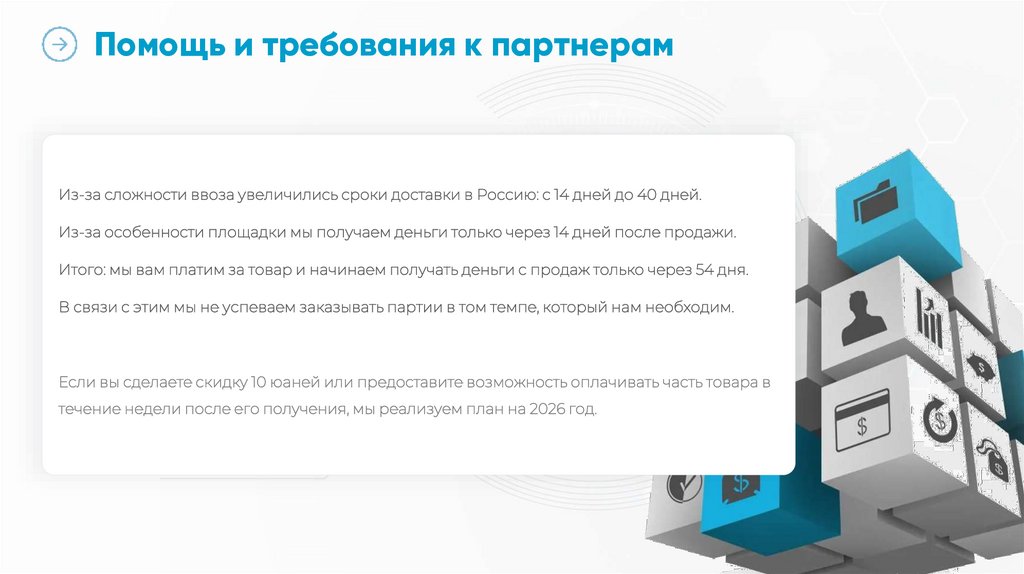 Помощь и требования к партнерамИз-за сложности ввоза увеличились сроки доставки в Россию: с 14 дней до 40 дней.