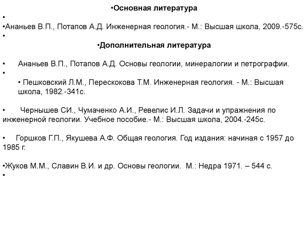 •Основная литература•Ананьев В.П., Потапов А.Д. Инженерная геология.- М.: Высшая школа, 2009.-575с.
