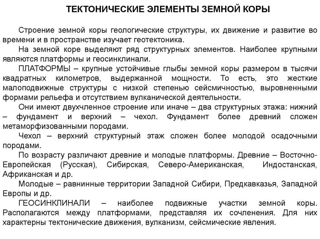 На земной коре выделяют ряд структурных элементов. Наиболее крупными