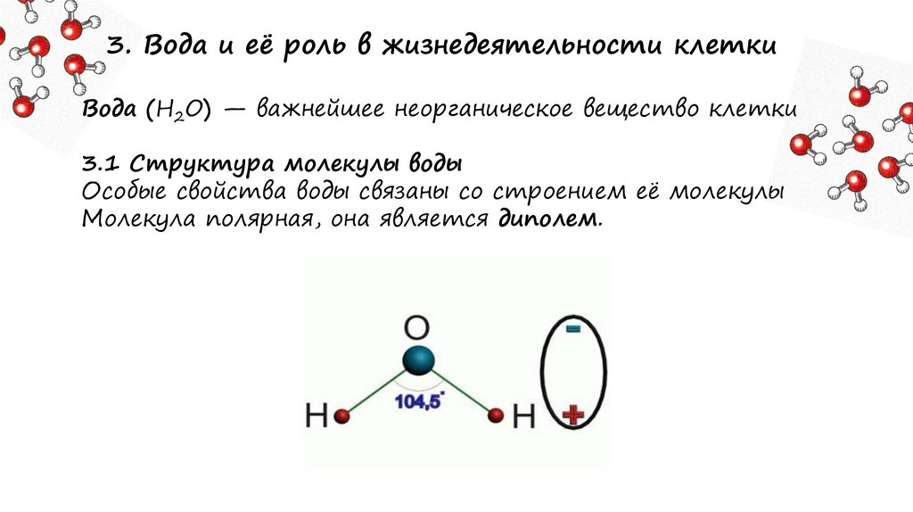 3. Вода и её роль в жизнедеятельности клеткиВода (H2O) — важнейшее неорганическое вещество клетки