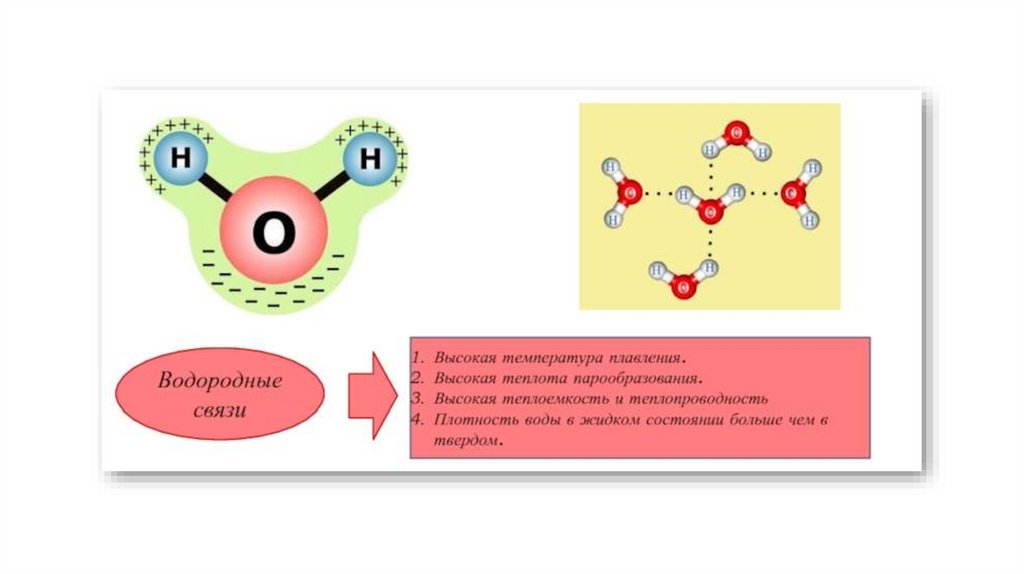 13. Полярные молекулы воды взаимодействуют между собой с образованием водородных связей, обуславливающих многие
