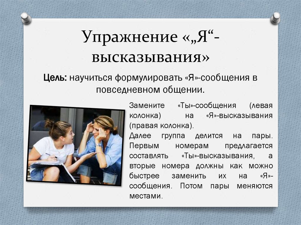 Упражнение «„Я“высказывания»Цель: научиться формулировать «Я»-сообщения в