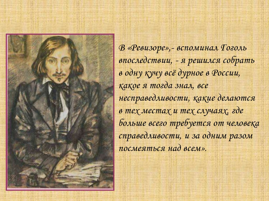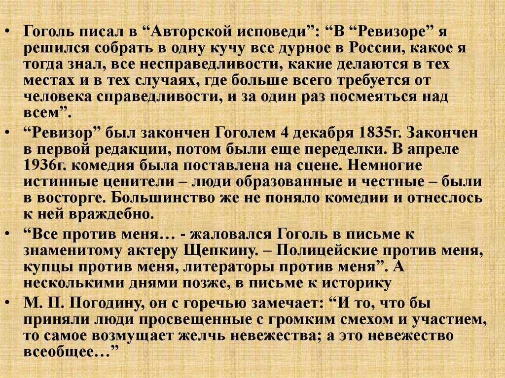 • Гоголь писал в “Авторской исповеди”: “В “Ревизоре” ярешился собрать в одну кучу все дурное в России, какое я