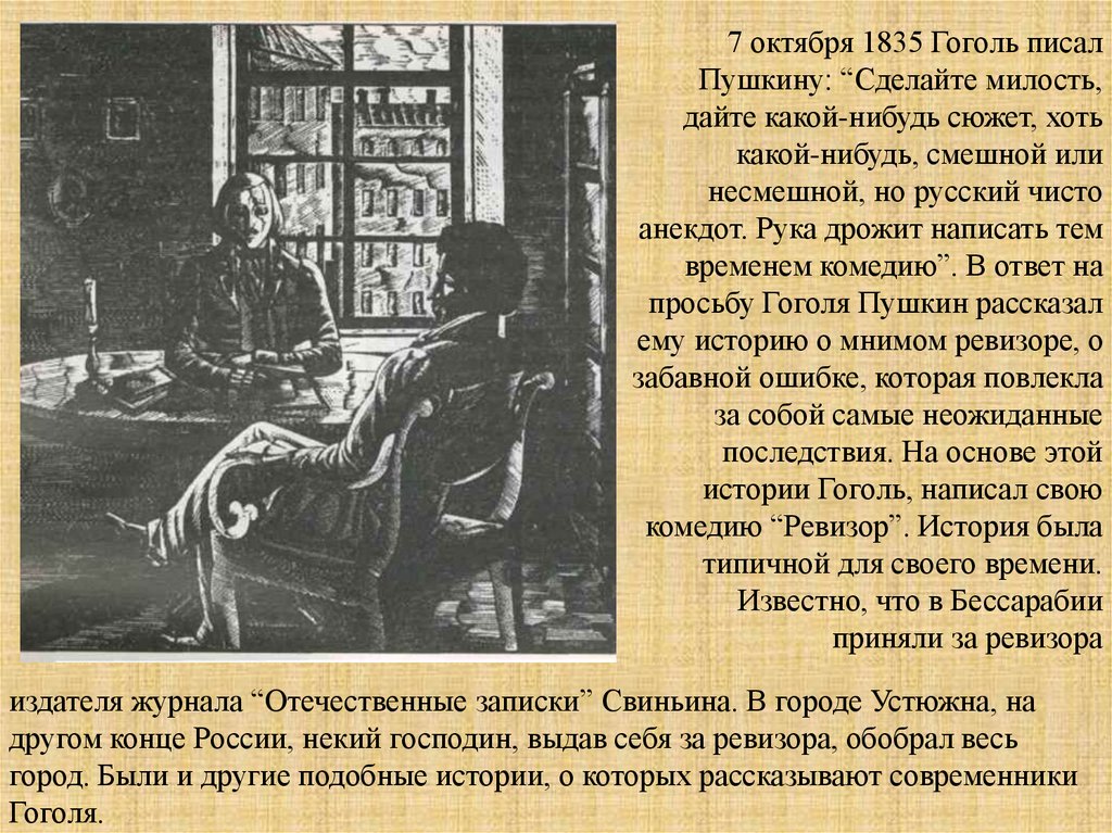 7 октября 1835 Гоголь писалПушкину: “Сделайте милость,