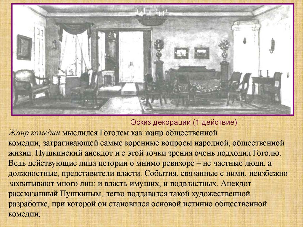 Эскиз декорации (1 действие)Жанр комедии мыслился Гоголем как жанр общественной