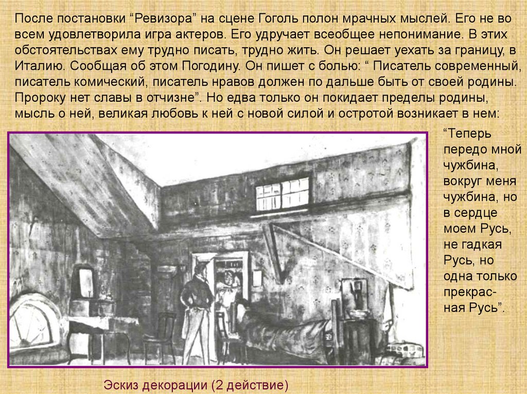 После постановки “Ревизора” на сцене Гоголь полон мрачных мыслей. Его не вовсем удовлетворила игра актеров. Его удручает всеобщее непонимание. В этих