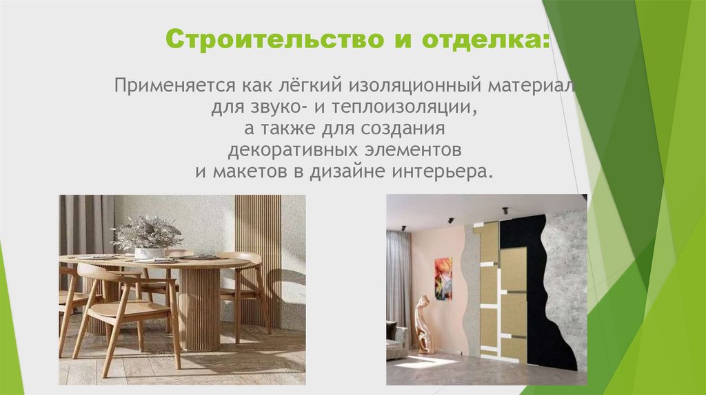 Строительство и отделка:Применяется как лёгкий изоляционный материал