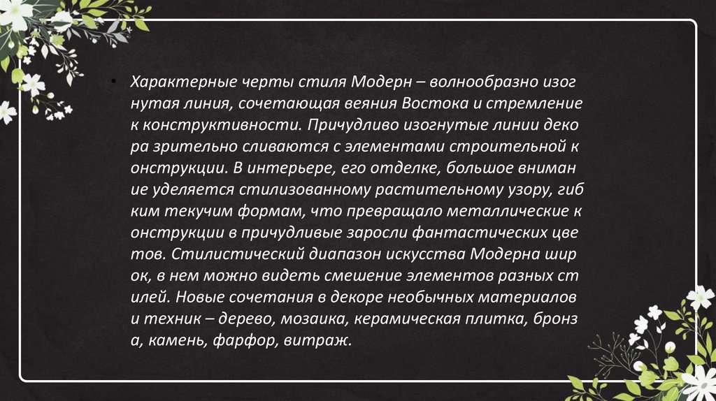 стилизованному растительному узору, гибким текучим формам,