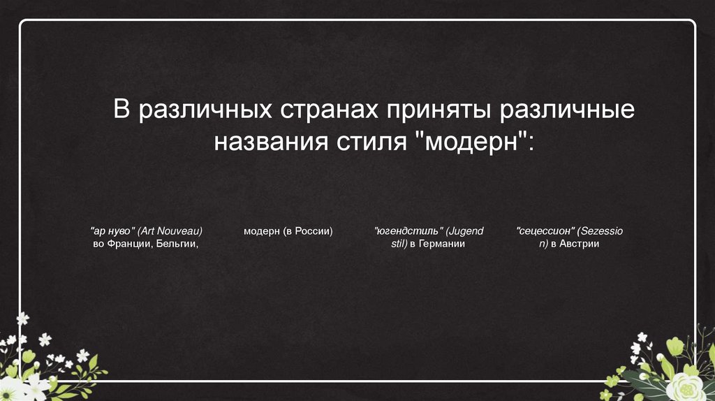 В различных странах приняты различныеназвания стиля "модерн":