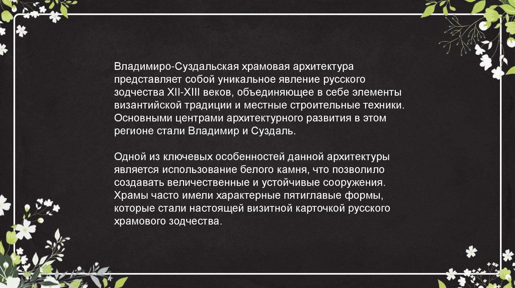 Владимиро-Суздальская храмовая архитектурапредставляет собой уникальное явление русского