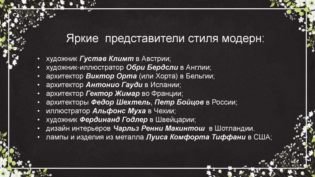 Яркие представители стиля модерн:художник Густав Климт в Австрии;