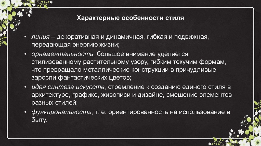 Характерные особенности стиля• линия – декоративная и динамичная, гибкая и подвижная,