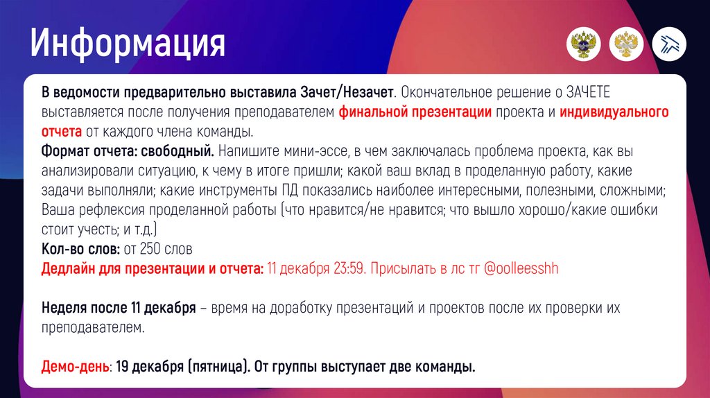 Дедлайн для презентации и отчета: 11 декабря 23:59. Присылать в лс тг @oolleesshh