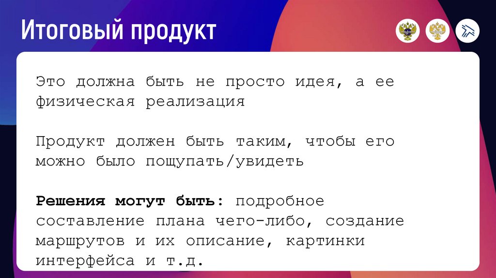 Итоговый продуктЭто должна быть не просто идея, а ее