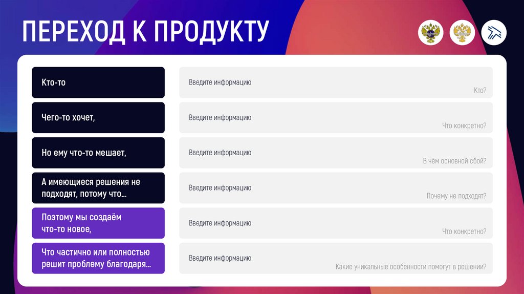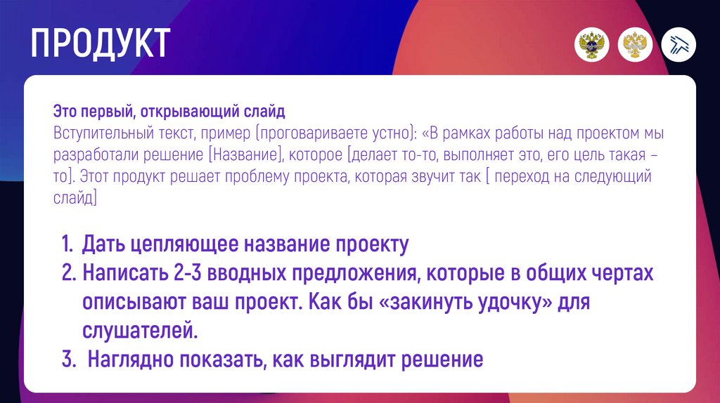 то]. Этот продукт решает проблему проекта, которая звучит так [ переход на следующий
