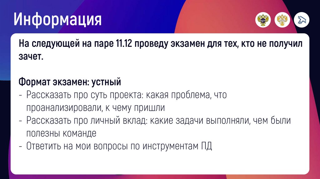 ИнформацияНа следующей на паре 11.12 проведу экзамен для тех, кто не получил