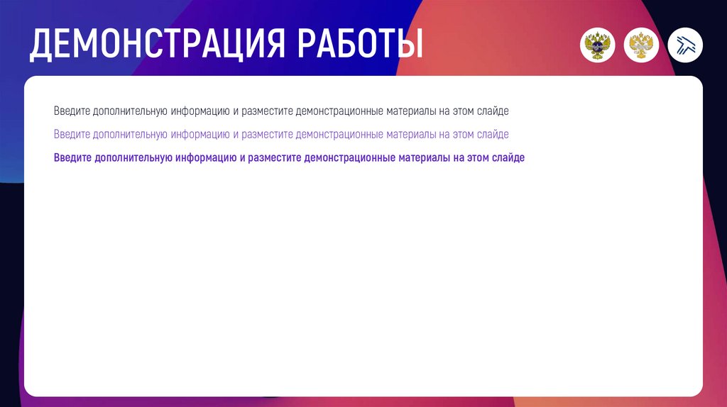 ДЕМОНСТРАЦИЯ РАБОТЫВведите дополнительную информацию и разместите демонстрационные материалы на этом слайде