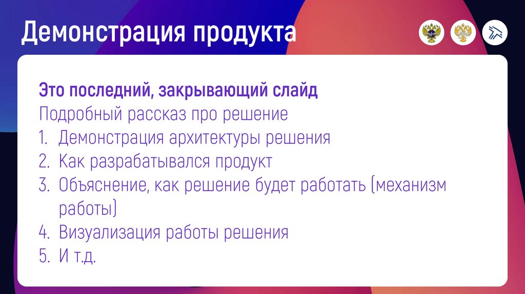 Демонстрация продуктаЭто последний, закрывающий слайд