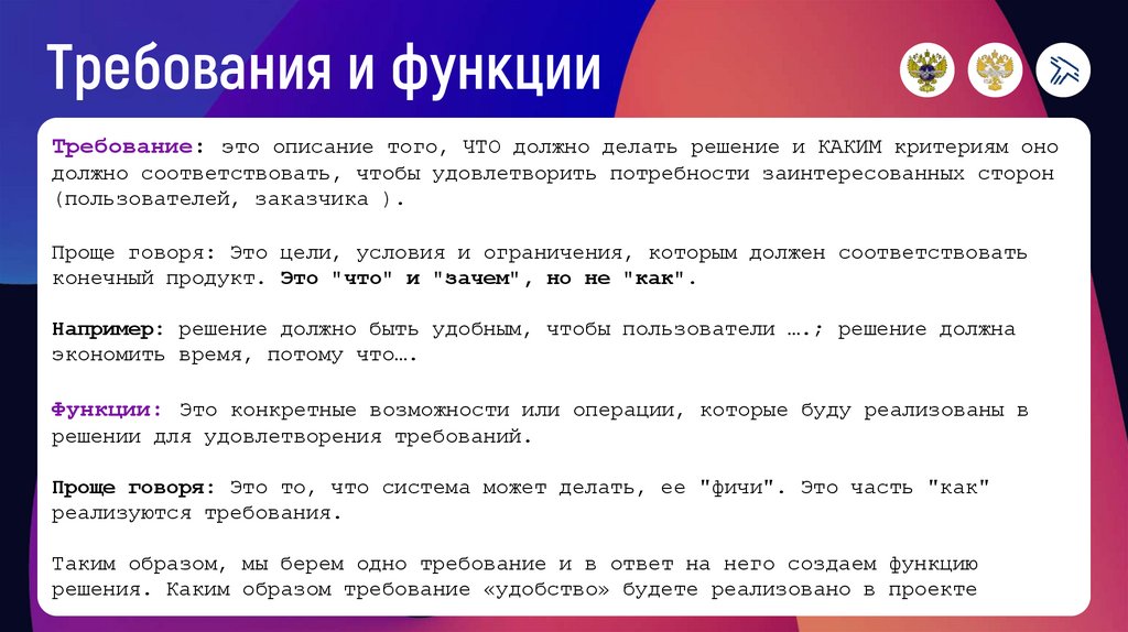 Требования и функцииТребование: это описание того, ЧТО должно делать решение и КАКИМ критериям оно