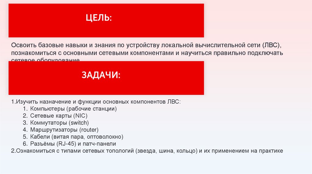 познакомиться с основными сетевыми компонентами и научиться правильно подключать