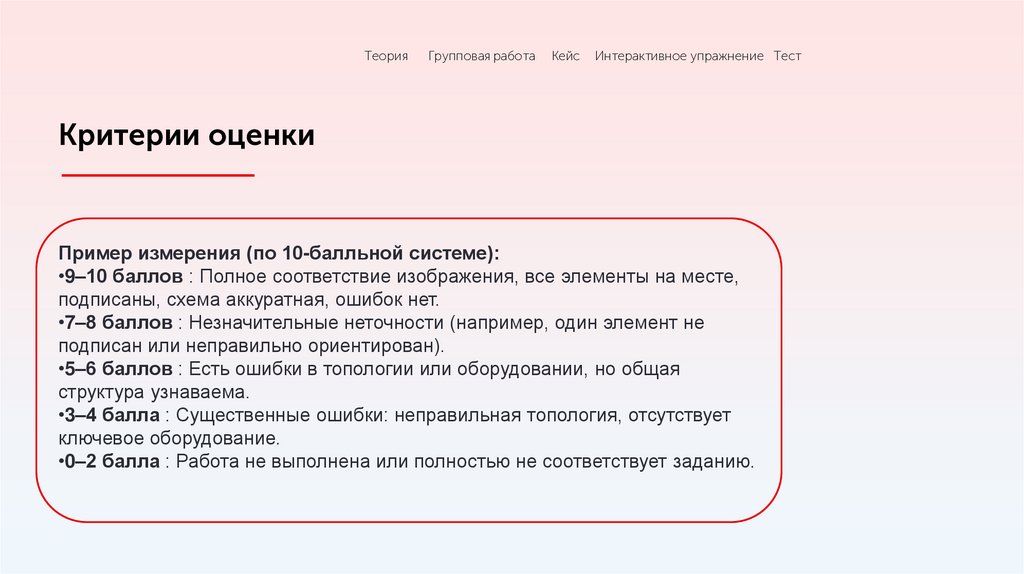 •5–6 баллов : Есть ошибки в топологии или оборудовании, но общая