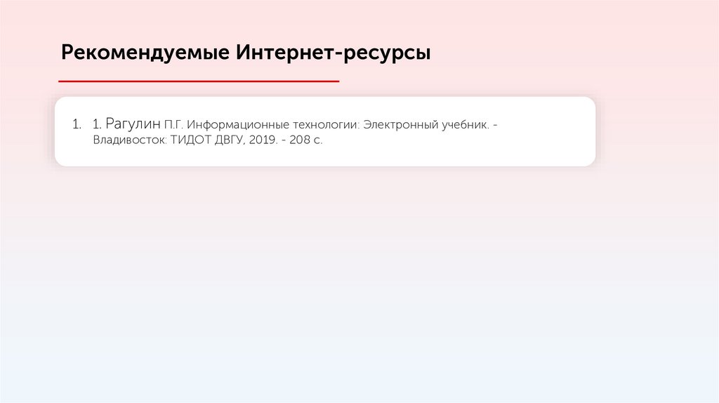 Рекомендуемые Интернет-ресурсы1. 1. Рагулин П.Г. Информационные технологии: Электронный учебник. Владивосток: ТИДОТ ДВГУ, 2019. - 208 с.