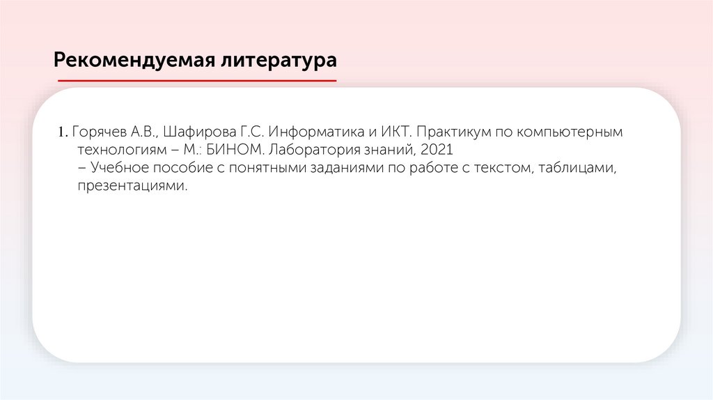 Рекомендуемая литература1. Горячев А.В., Шафирова Г.С. Информатика и ИКТ. Практикум по компьютерным