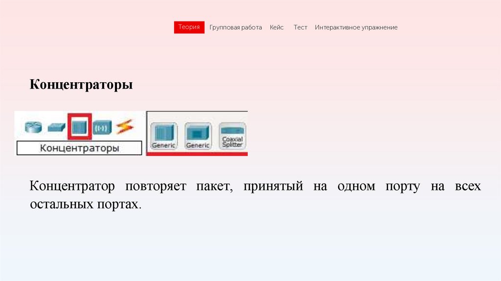 Концентратор повторяет пакет, принятый на одном порту на всех