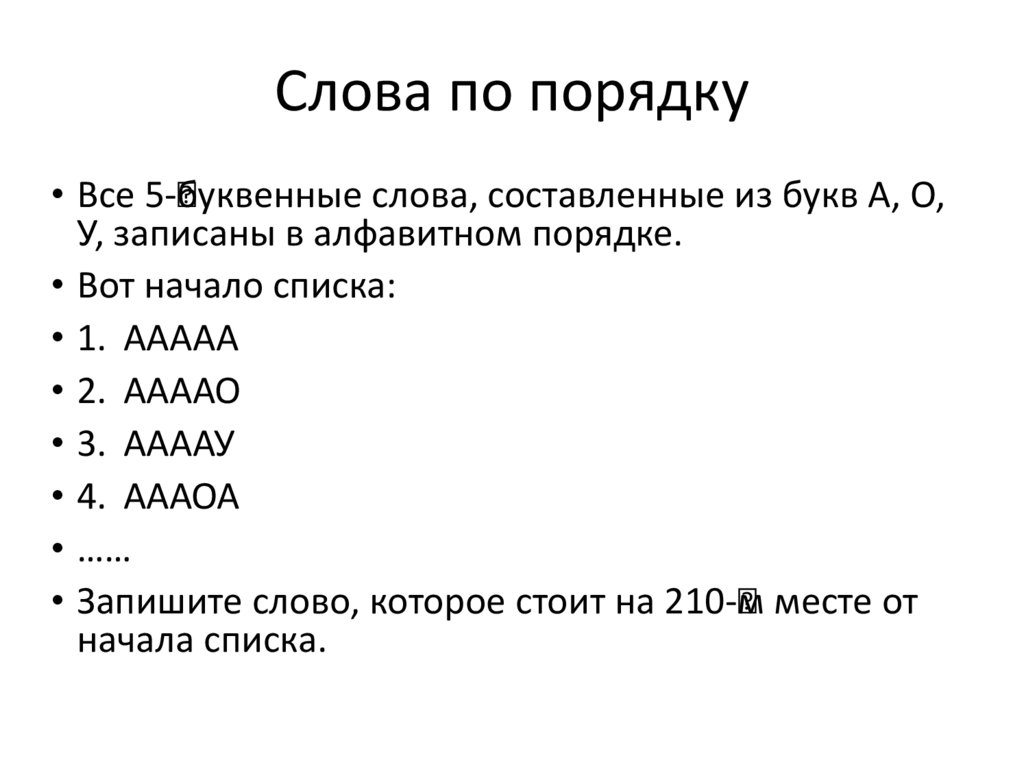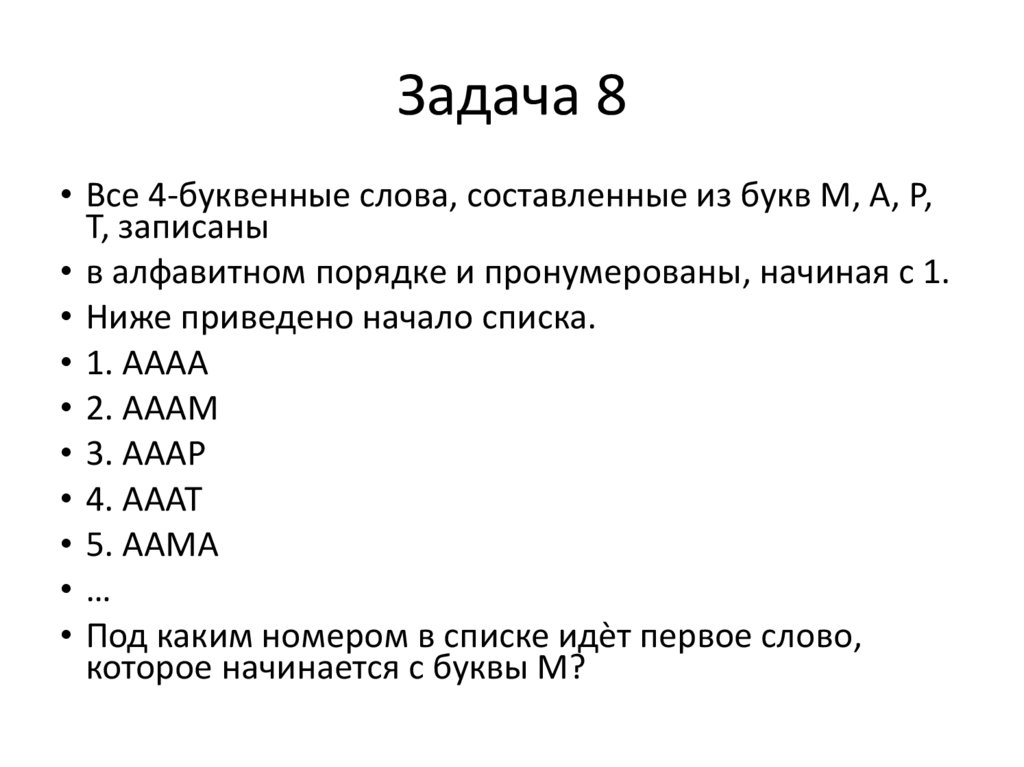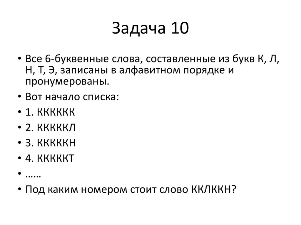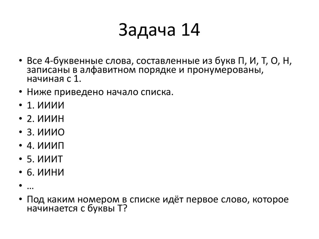 Задача 14• Все 4-буквенные слова, составленные из букв П, И, Т, О, Н,
