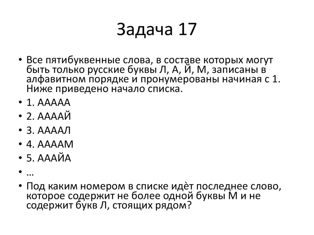 Задача 17• Все пятибуквенные слова, в составе которых могут