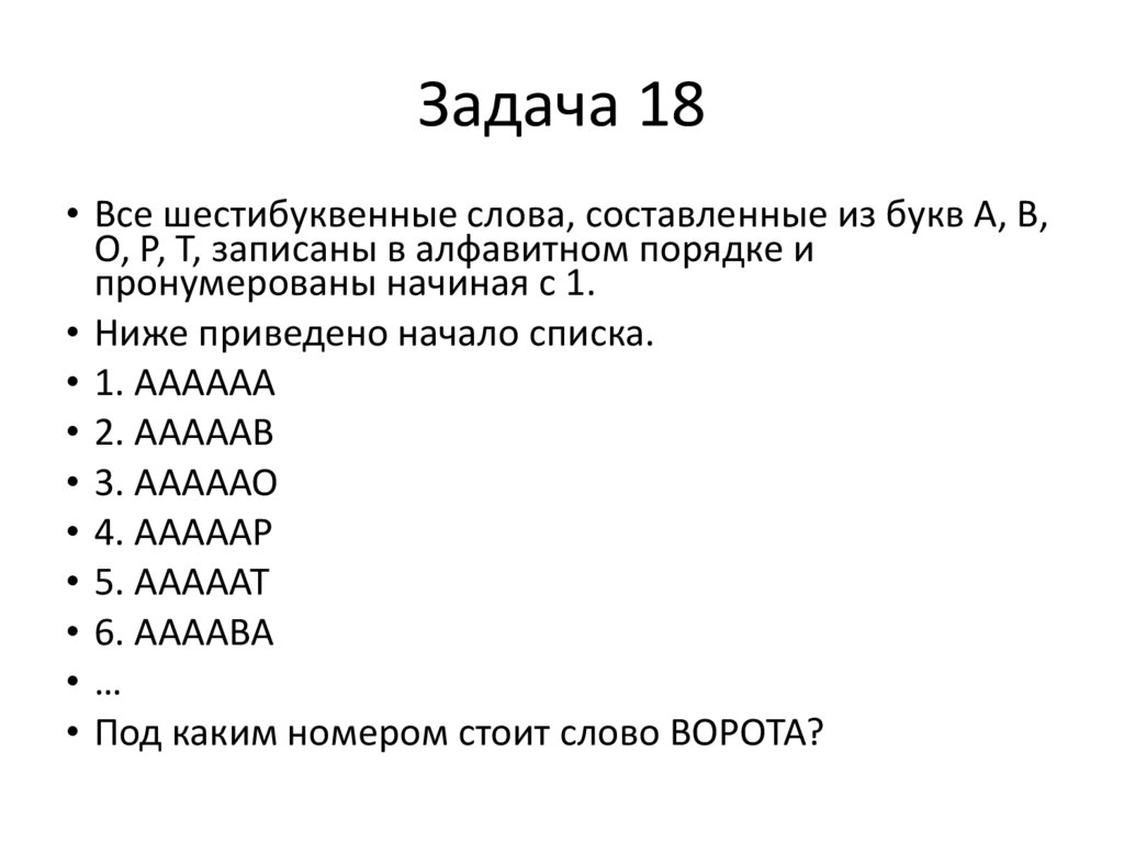 Задача 18• Все шестибуквенные слова, составленные из букв А, В,