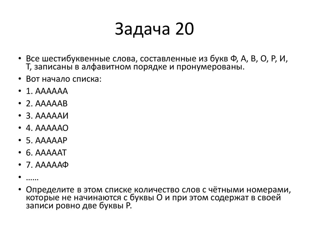 Задача 20• Все шестибуквенные слова, составленные из букв Ф, А, В, О, Р, И,